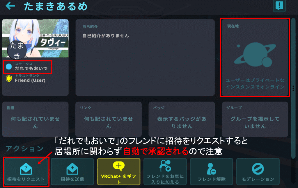 「だれでもおいで」のステータスでプライベートインスタンスにいるフレンドに、