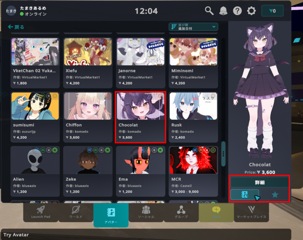 気になるアバターを選んで、「詳細」ボタンを押すと、
