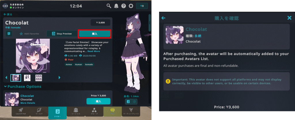 VRChat内だけでアバターの購入・導入が完結できるようになりました!